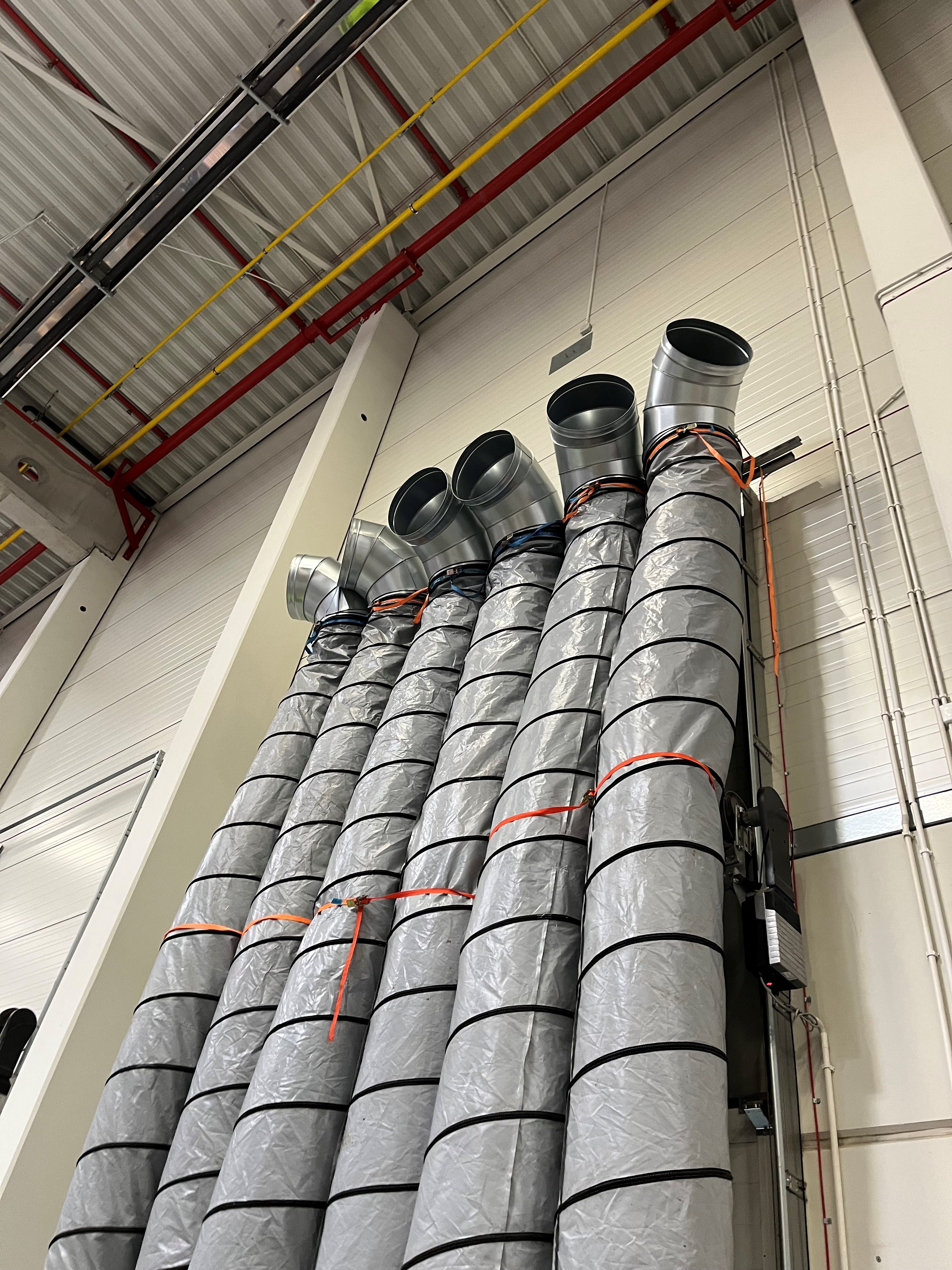 Cały system działa w pełni automatycznie – centrale chłodnicze AIRBOX150 pracują z maksymalnym sprężem 650 Pa, a wysoko zamocowane dyfuzory skutecznie rozprowadzają powietrze do odległych stref hali.